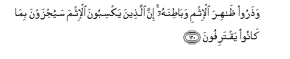 120. Watharoo thahira al-ithmi wabatinahu inna allatheena yaksiboona al-ithma sayujzawna bima kanoo yaqtarifoona