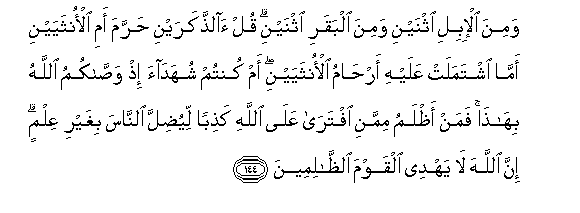 144. Wamina al-ibili ithnayni wamina albaqari ithnayni qul alththakarayni harrama ami alonthayayni amma ishtamalat AAalayhi arhamu alonthayayni am kuntum shuhadaa ith wassakumu Allahu bihatha faman athlamu mimmani iftara AAala Allahi kathiban liyudilla alnnasa bighayri AAilmin inna Allaha la yahdee alqawma alththalimeena