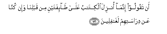 156. An taqooloo innama onzila alkitabu AAala ta-ifatayni min qablina wa-in kunna AAan dirasatihim laghafileena