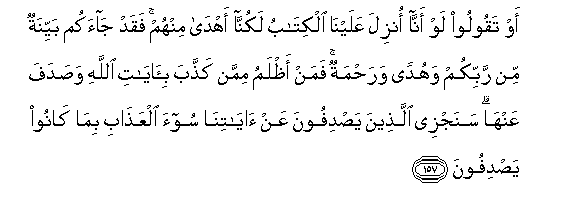 157. Aw taqooloo law anna onzila AAalayna alkitabu lakunna ahda minhum faqad jaakum bayyinatun min rabbikum wahudan warahmatun faman athlamu mimman kaththaba bi-ayati Allahi wasadafa AAanha sanajzee allatheena yasdifoona AAan ayatina soo-a alAAathabi bima kanoo yasdifoona