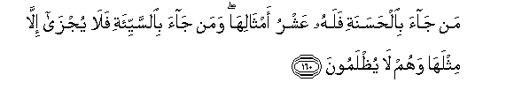 160. Man jaa bialhasanati falahu AAashru amthaliha waman jaa bialssayyi-ati fala yujza illa mithlaha wahum la yuthlamoona