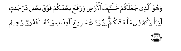165. Wahuwa allathee jaAAalakum khala-ifa al-ardi warafaAAa baAAdakum fawqa baAAdin darajatin liyabluwakum fee ma atakum inna rabbaka sareeAAu alAAiqabi wa-innahu laghafoorun raheemun