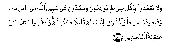 86. Wala taqAAudoo bikulli siratin tooAAidoona watasuddoona AAan sabeeli Allahi man amana bihi watabghoonaha AAiwajan waothkuroo ith kuntum qaleelan fakaththarakum waonthuroo kayfa kana AAaqibatu almufsideena