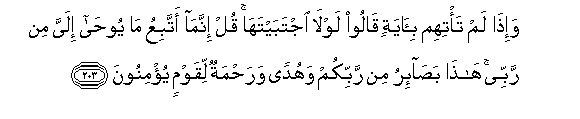 203. Wa-itha lam ta/tihim bi-ayatin qaloo lawla ijtabaytaha qul innama attabiAAu ma yooha ilayya min rabbee hatha basa-iru min rabbikum wahudan warahmatun liqawmin yu/minoona