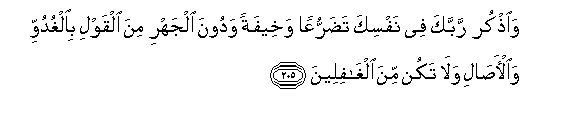 205. Waothkur rabbaka fee nafsika tadarruAAan wakheefatan wadoona aljahri mina alqawli bialghuduwwi waal-asali wala takun mina alghafileena