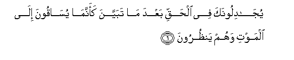 6. Yujadiloonaka fee alhaqqi baAAda ma tabayyana kaannama yusaqoona ila almawti wahum yanthuroona