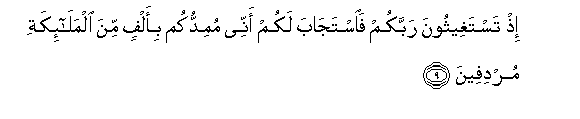 9. Ith tastagheethoona rabbakum faistajaba lakum annee mumiddukum bi-alfin mina almala-ikati murdifeena