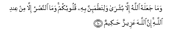 10. Wama jaAAalahu Allahu illa bushra walitatma-inna bihi quloobukum wama alnnasru illa min AAindi Allahi inna Allaha AAazeezun hakeemun