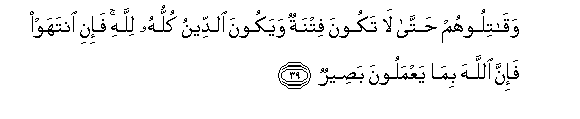 39. Waqatiloohum hatta la takoona fitnatun wayakoona alddeenu kulluhu lillahi fa-ini intahaw fa-inna Allaha bima yaAAmaloona baseerun