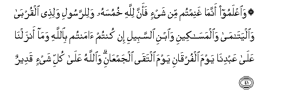 41. WaiAAlamoo annama ghanimtum min shay-in faanna lillahi khumusahu walilrrasooli walithee alqurba waalyatama waalmasakeeni waibni alssabeeli in kuntum amantum biAllahi wama anzalna AAala AAabdina yawma alfurqani yawma iltaqa aljamAAani waAllahu AAala kulli shay-in qadeerun