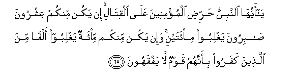 65. Ya ayyuha alnnabiyyu harridi almu/mineena AAala alqitali in yakun minkum AAishroona sabiroona yaghliboo mi-atayni wa-in yakun minkum mi-atun yaghliboo alfan mina allatheena kafaroo bi-annahum qawmun la yafqahoona