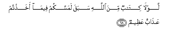 68. Lawla kitabun mina Allahi sabaqa lamassakum feema akhathtum AAathabun AAatheemun