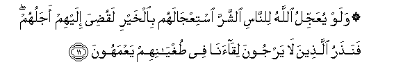 11. Walaw yuAAajjilu Allahu lilnnasi alshsharra istiAAjalahum bialkhayri laqudiya ilayhim ajaluhum fanatharu allatheena la yarjoona liqaana fee tughyanihim yaAAmahoona