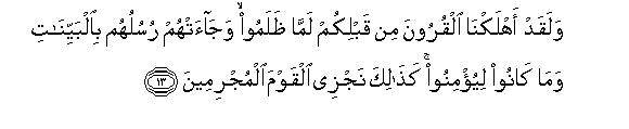 13. Walaqad ahlakna alquroona min qablikum lamma thalamoo wajaat-hum rusuluhum bialbayyinati wama kanoo liyu/minoo kathalika najzee alqawma almujrimeena