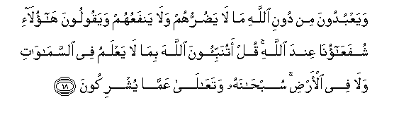 18. WayaAAbudoona min dooni Allahi ma la yadurruhum wala yanfaAAuhum wayaqooloona haola-i shufaAAaona AAinda Allahi qul atunabbi-oona Allaha bima la yaAAlamu fee alssamawati wala fee al-ardi subhanahu wataAAala AAamma yushrikoona