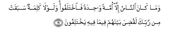 19. Wama kana alnnasu illa ommatan wahidatan faikhtalafoo walawla kalimatun sabaqat min rabbika laqudiya baynahum feema feehi yakhtalifoona