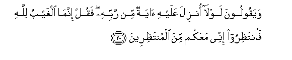 20. Wayaqooloona lawla onzila AAalayhi ayatun min rabbihi faqul innama alghaybu lillahi faintathiroo innee maAAakum mina almuntathireena
