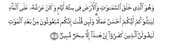 7. Wahuwa allathee khalaqa alssamawati waal-arda fee sittati ayyamin wakana AAarshuhu AAala alma-i liyabluwakum ayyukum ahsanu AAamalan wala-in qulta innakum mabAAoothoona min baAAdi almawti layaqoolanna allatheena kafaroo in hatha illa sihrun mubeenun