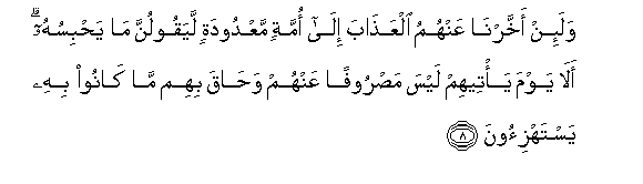 8. Wala-in akhkharna AAanhumu alAAathaba ila ommatin maAAdoodatin layaqoolunna ma yahbisuhu ala yawma ya/teehim laysa masroofan AAanhum wahaqa bihim ma kanoo bihi yastahzi-oona