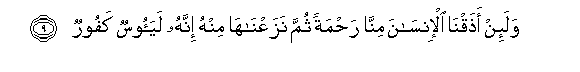 9. Wala-in athaqna al-insana minna rahmatan thumma nazaAAnaha minhu innahu layaoosun kafoorun