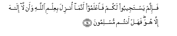 14. Fa-illam yastajeeboo lakum faiAAlamoo annama onzila biAAilmi Allahi waan la ilaha illa huwa fahal antum muslimoona