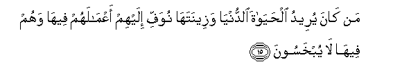 15. Man kana yureedu alhayata alddunya wazeenataha nuwaffi ilayhim aAAmalahum feeha wahum feeha la yubkhasoona