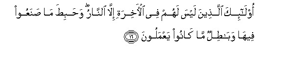 16. Ola-ika allatheena laysa lahum fee al-akhirati illa alnnaru wahabita ma sanaAAoo feeha wabatilun ma kanoo yaAAmaloona