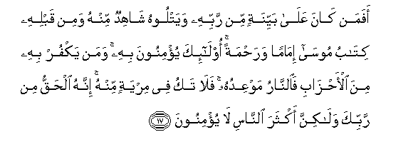 17. Afaman kana AAala bayyinatin min rabbihi wayatloohu shahidun minhu wamin qablihi kitabu moosa imaman warahmatan ola-ika yu/minoona bihi waman yakfur bihi mina al-ahzabi faalnnaru mawAAiduhu fala taku fee miryatin minhu innahu alhaqqu min rabbika walakinna akthara alnnasi la yu/minoona