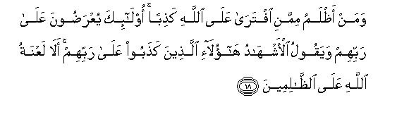 18. Waman athlamu mimmani iftara AAala Allahi kathiban ola-ika yuAAradoona AAala rabbihim wayaqoolu al-ashhadu haola-i allatheena kathaboo AAala rabbihim ala laAAnatu Allahi AAala alththalimeena