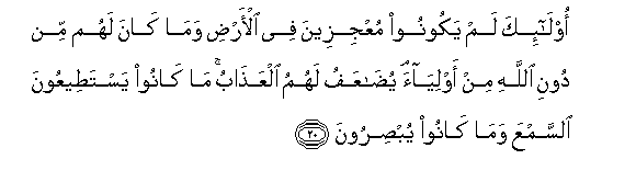 20. Ola-ika lam yakoonoo muAAjizeena fee al-ardi wama kana lahum min dooni Allahi min awliyaa yudaAAafu lahumu alAAathabu ma kanoo yastateeAAoona alssamAAa wama kanoo yubsiroona