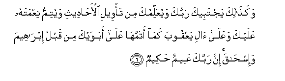 6. Wakathalika yajtabeeka rabbuka wayuAAallimuka min ta/weeli al-ahadeethi wayutimmu niAAmatahu AAalayka waAAala ali yaAAqooba kama atammaha AAala abawayka min qablu ibraheema wa-ishaqa inna rabbaka AAaleemun hakeemun