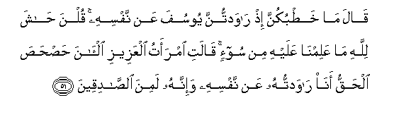 51. Qala ma khatbukunna ith rawadtunna yoosufa AAan nafsihi qulna hasha lillahi ma AAalimna AAalayhi min soo-in qalati imraatu alAAazeezi al-ana hashasa alhaqqu ana rawadtuhu AAan nafsihi wa-innahu lamina alssadiqeena