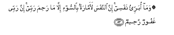 53. Wama obarri-o nafsee inna alnnafsa laammaratun bialssoo-i illa ma rahima rabbee inna rabbee ghafoorun raheemun