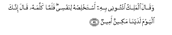 54. Waqala almaliku i/toonee bihi astakhlishu linafsee falamma kallamahu qala innaka alyawma ladayna makeenun ameenun