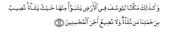56. Wakathalika makanna liyoosufa fee al-ardi yatabawwao minha haythu yashao nuseebu birahmatina man nashao wala nudeeAAu ajra almuhsineena