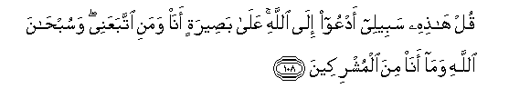 108. Qul hathihi sabeelee adAAoo ila Allahi AAala baseeratin ana wamani ittabaAAanee wasubhana Allahi wama ana mina almushrikeena