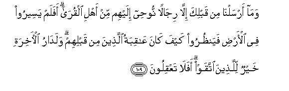 109. Wama arsalna min qablika illa rijalan noohee ilayhim min ahli alqura afalam yaseeroo fee al-ardi fayanthuroo kayfa kana AAaqibatu allatheena min qablihim waladaru al-akhirati khayrun lillatheena ittaqaw afala taAAqiloona