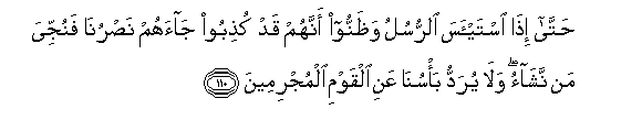 110. Hatta itha istay-asa alrrusulu wathannoo annahum qad kuthiboo jaahum nasruna fanujjiya man nashao wala yuraddu ba/suna AAani alqawmi almujrimeena