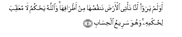 41. Awa lam yaraw anna na/tee al-arda nanqusuha min atrafiha waAllahu yahkumu la muAAaqqiba lihukmihi wahuwa sareeAAu alhisabi