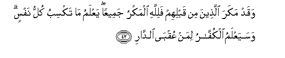 42. Waqad makara allatheena min qablihim falillahi almakru jameeAAan yaAAlamu ma taksibu kullu nafsin wasayaAAlamu alkuffaru liman AAuqba alddari