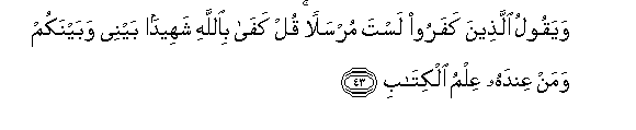 43. Wayaqoolu allatheena kafaroo lasta mursalan qul kafa biAllahi shaheedan baynee wabaynakum waman AAindahu AAilmu alkitabi