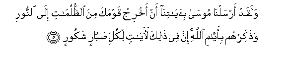 5. Walaqad arsalna moosa bi-ayatina an akhrij qawmaka mina alththulumati ila alnnoori wathakkirhum bi-ayyami Allahi inna fee thalika laayatin likulli sabbarin shakoorin