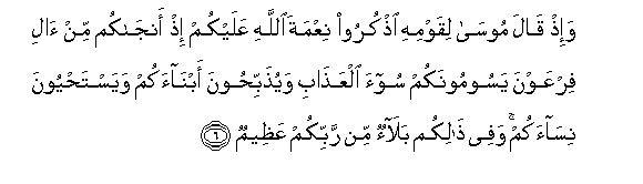 6. Wa-ith qala moosa liqawmihi othkuroo niAAmata Allahi AAalaykum ith anjakum min ali firAAawna yasoomoonakum soo-a alAAathabi wayuthabbihoona abnaakum wayastahyoona nisaakum wafee thalikum balaon min rabbikum AAatheemun