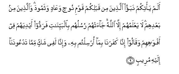 9. Alam ya/tikum nabao allatheena min qablikum qawmi noohin waAAadin wathamooda waallatheena min baAAdihim la yaAAlamuhum illa Allahu jaat-hum rusuluhum bialbayyinati faraddoo aydiyahum fee afwahihim waqaloo inna kafarna bima orsiltum bihi wa-inna lafee shakkin mimma tadAAoonana ilayhi mureebun