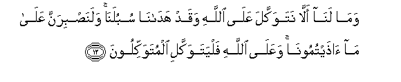 12. Wama lana alla natawakkala AAala Allahi waqad hadana subulana walanasbiranna AAala ma athaytumoona waAAala Allahi falyatawakkali almutawakkiloona