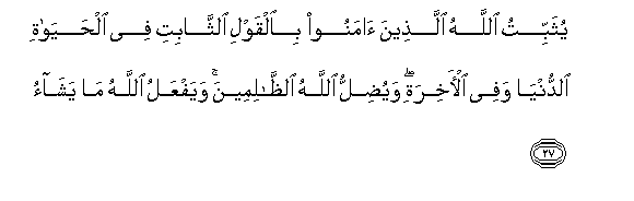 27. Yuthabbitu Allahu allatheena amanoo bialqawli alththabiti fee alhayati alddunya wafee al-akhirati wayudillu Allahu alththalimeena wayafAAalu Allahu ma yasha/o
