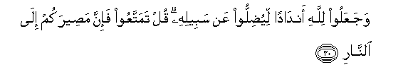 30. WajaAAaloo lillahi andadan liyudilloo AAan sabeelihi qul tamattaAAoo fa-inna maseerakum ila alnnari