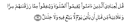 31. Qul liAAibadiya allatheena amanoo yuqeemoo alssalata wayunfiqoo mimma razaqnahum sirran waAAalaniyatan min qabli an ya/tiya yawmun la bayAAun feehi wala khilalun