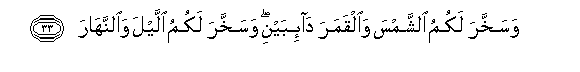 33. Wasakhkhara lakumu alshshamsa waalqamara da-ibayni wasakhkhara lakumu allayla waalnnahara