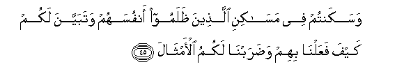 45. Wasakantum fee masakini allatheena thalamoo anfusahum watabayyana lakum kayfa faAAalna bihim wadarabna lakumu al-amthala